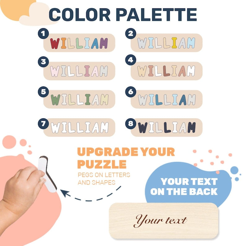 The wooden name puzzle is a fun and effective way to teach your kids letters, colors, shapes, and…their unique names! Puzzle with pegs will save the day for parents looking to both entertain and teach the little ones. Made of non-toxic and durable materials, these Montessori toys are safe for little delicate hands. Besides, we produce each puzzle with smooth edges to ensure our little clients won't get hurt.
