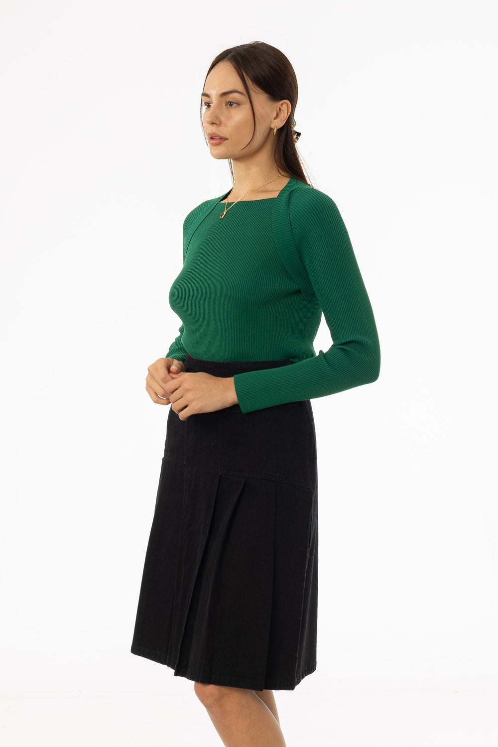 This sweater looks layered but is secretly just one piece—a shortcut to looking put-together without the fuss. The shrug detail instantly gives it a unique twist, making even simple bottoms feel more elevated. It’s playful, modern, and bound to spark compliments. A piece that works as well for a casual day out as it does for something more dressed up.